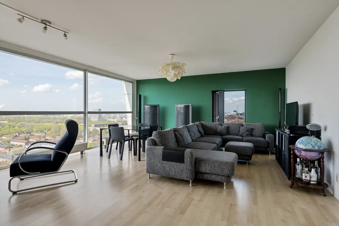 De royale en lichte woonkamer met open keuken biedt een prachtig, weids uitzicht over de stad. De keuken is eenvoudig en de inbouwapparatuur is aan vervanging toe. De woning beschikt over drie praktische slaap-/werkkamers die flexibel in te richten zijn, afhankelijk van jouw woonwensen.