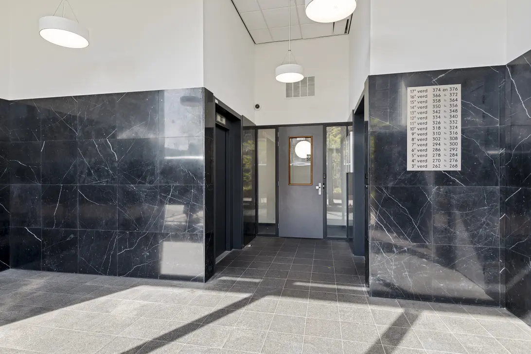 De centrale entree is afgesloten en voorzien van een videofooninstallatie, brievenbussen en toegang tot het trappenhuis, de liften en de individuele bergingen.
