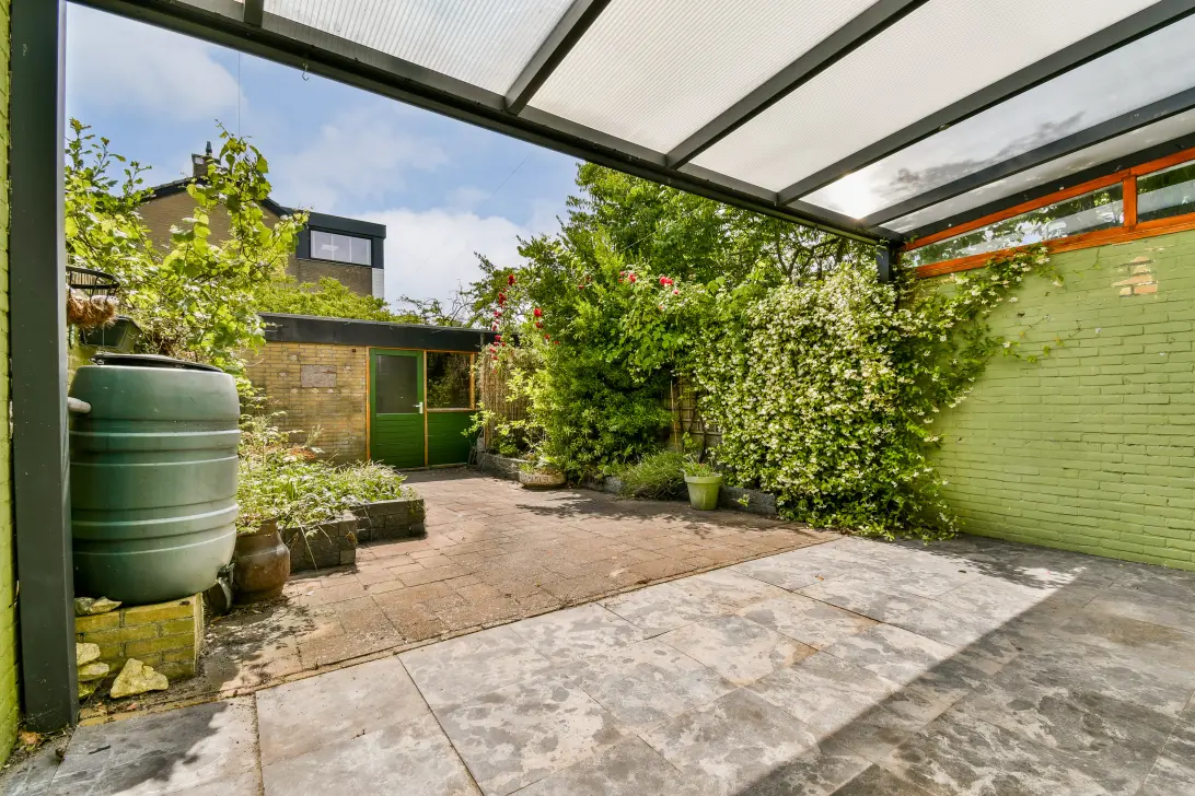 Ruime entree, modern toilet, open woonkeuken aan de voorzijde, lichte en tuingerichte woonkamer met schuifpui naar de zonnige achtertuin. Hier vind je sierbestrating, een brede overkapping en toegang tot de stenen garage.