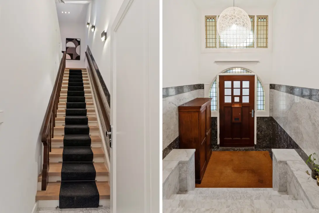 A grand private entrance with marble detailing leads to the apartment. From the landing, a bedroom with its own shower room is accessible. The spacious staircase with guest toilet provides access to the generous living kitchen, equipped with luxurious built-in appliances and French doors opening onto a large rear terrace. The bright living room with fireplace and built-in cabinets connects to a second terrace and a separate TV room, ideal as a study or relaxation area.