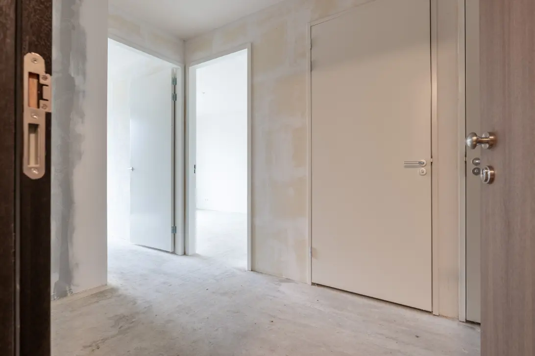 De woonkamer vormt het hart van het appartement. De keukenopstelling is casco uitgevoerd en volledig naar eigen smaak en indeling te realiseren. Grote raampartijen zorgen voor een prettige lichtinval en versterken de verbinding met de omgeving.