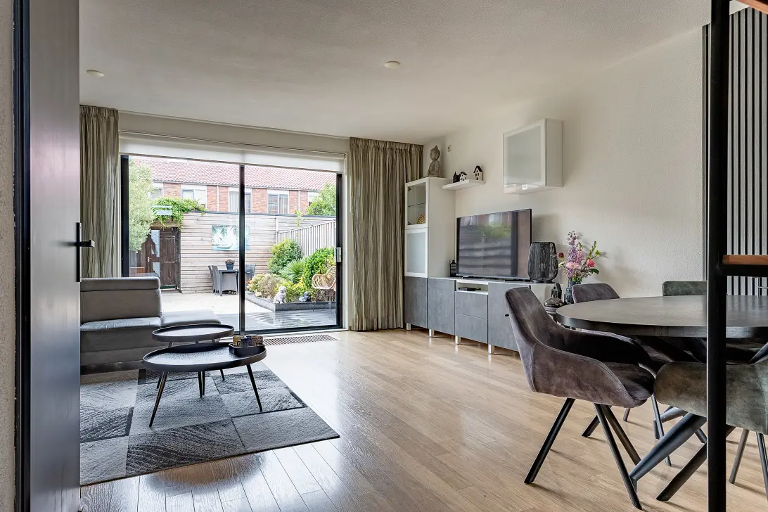 De woning beschikt over een prachtige, goed onderhouden tuin van 65m2 met een zuidwestelijke ligging, ideaal voor zonnige middagen en avonden buiten. De tuin is bereikbaar vanuit de woonkamer via schuifdeuren en heeft ook een achterom. Daarnaast is er een vrijstaande houten berging met elektriciteit en een veranda.