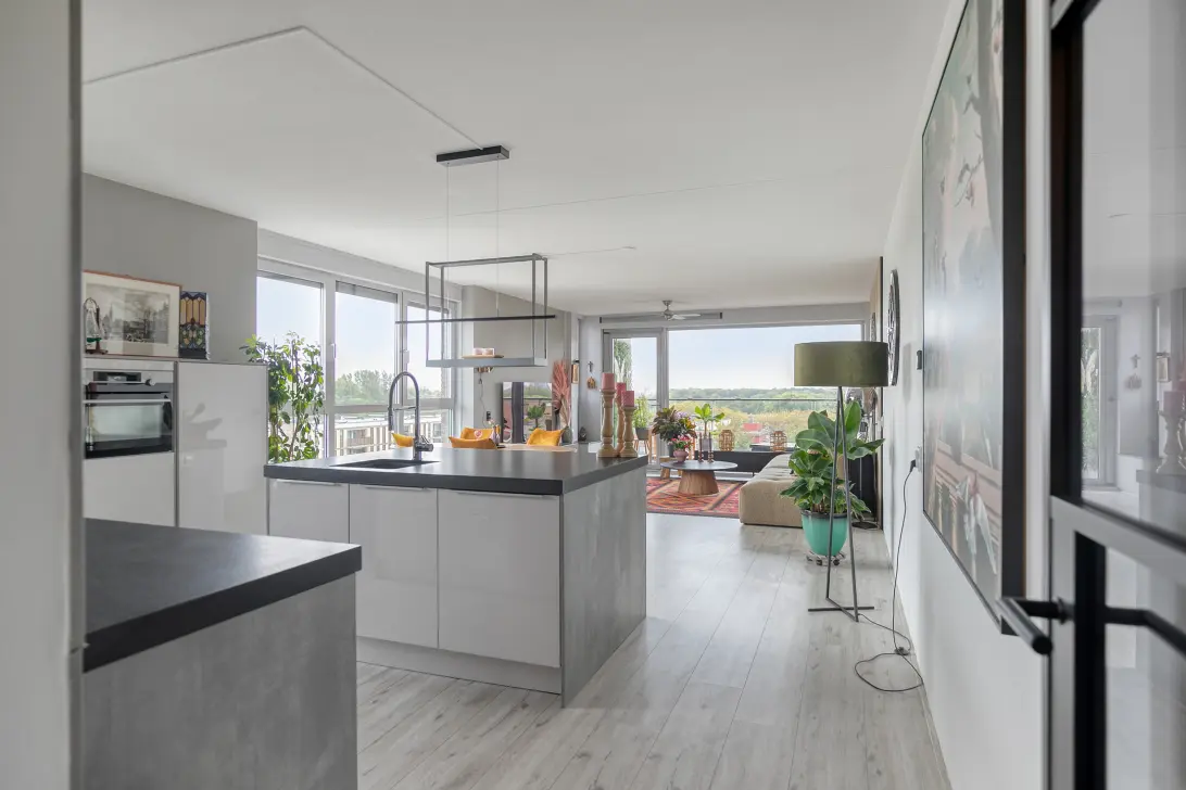 Zodra je binnenkomt valt meteen de ruimte en het licht op. De woonkamer met grote raampartijen en het (vanuit de woonkamer bereikbare)balkon bieden een prachtig vrij uitzicht over groen en Amsterdam centrum ; je ziet zelfs de Cruise schepen in de verte varen. De moderne woonkeuken is voorzien van diverse inbouwapparatuur en direct aan de keuken grenst de bijkeuken. Hier bevinden zich de cv-opstelling en de witgoedaansluitingen.