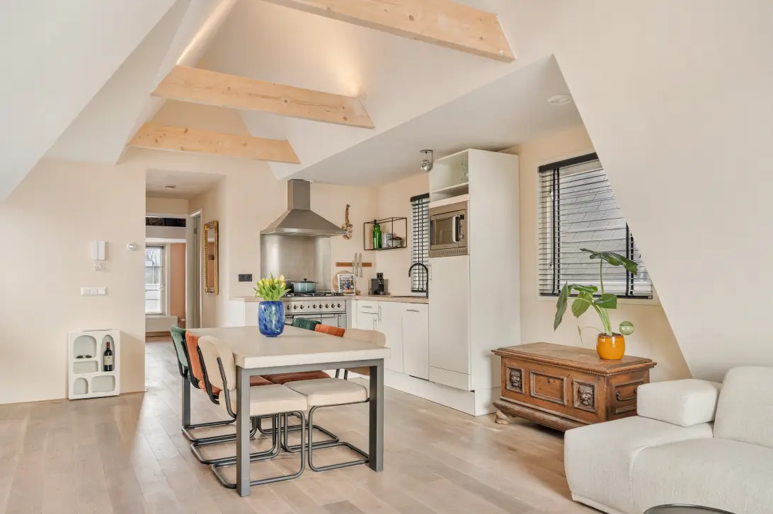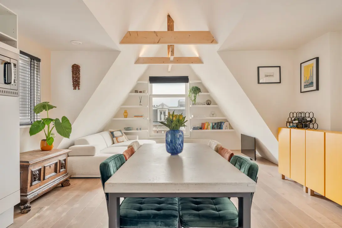 Op een levendige plek, op korte afstand van De Hallen en de Ten Katemarkt, bevindt zich dit sfeervolle appartement op de bovenste verdieping. De woning wordt gekenmerkt door karakteristieke houten balken en beschikt over een eigen opgang vanaf de vierde verdieping, wat zorgt voor extra rust en privacy.