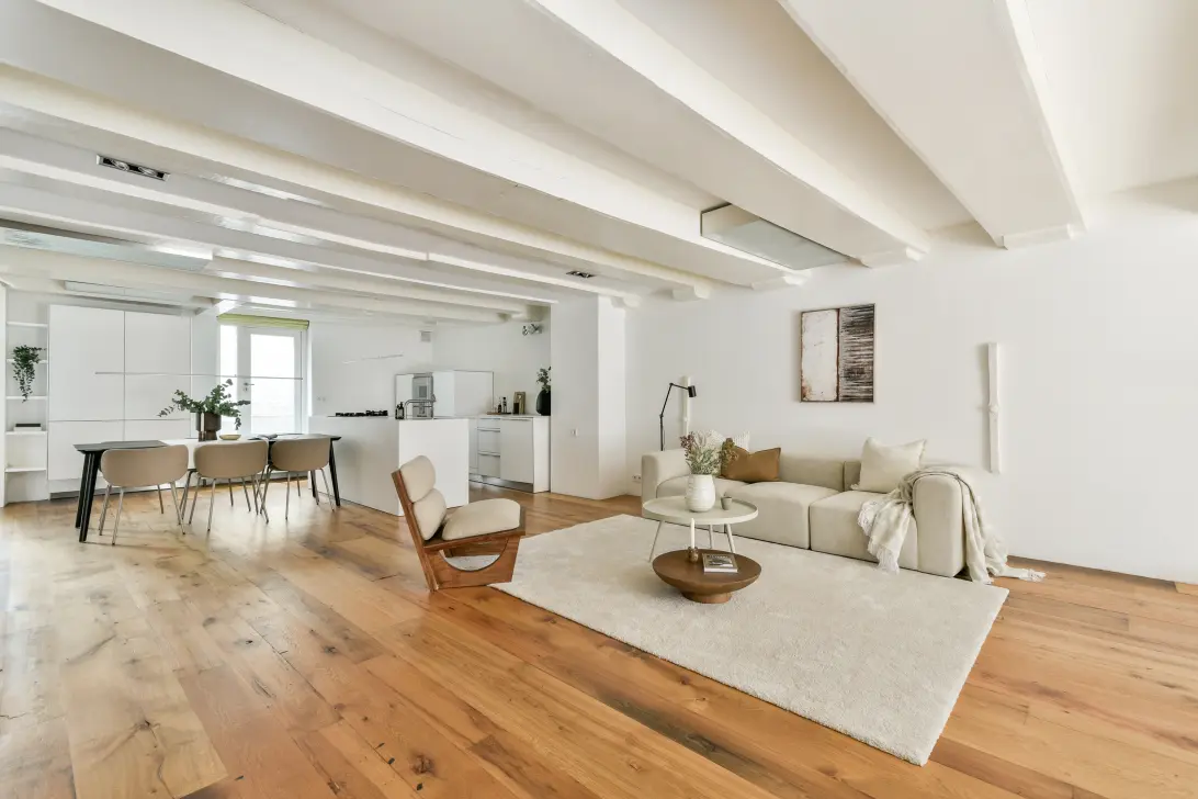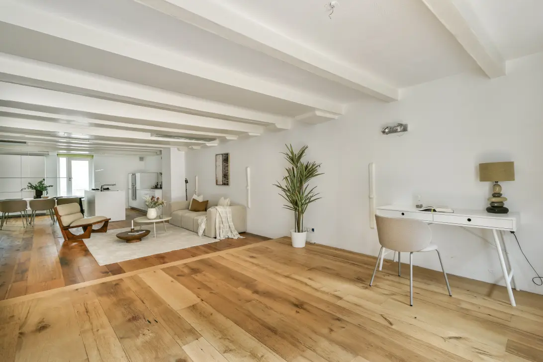 The loft is located on the ground floor and seamlessly blends historic character with modern comfort. The spacious living area with open-plan kitchen forms the heart of the home and provides access to an intimate private patio — the perfect spot for a morning coffee or a quiet evening, offering complete privacy.