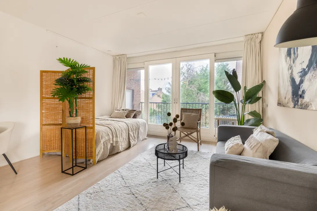 Via de centrale entree en het trappenhuis bereik je de studio. De lichte leefruimte wordt gekenmerkt door grote raampartijen en een schuifpui naar het balkon, waar je heerlijk kunt genieten van de ochtendzon. De open keuken is praktisch ingericht en voorzien van een vaatwasser en een gasfornuis. Wonen en slapen zijn gecombineerd in één ruimte, wat met een slimme indeling optimaal te benutten is. De nette badkamer is compleet uitgerust met een douche, wastafelmeubel met kastruimte, toilet en een aansluiting voor de wasmachine.