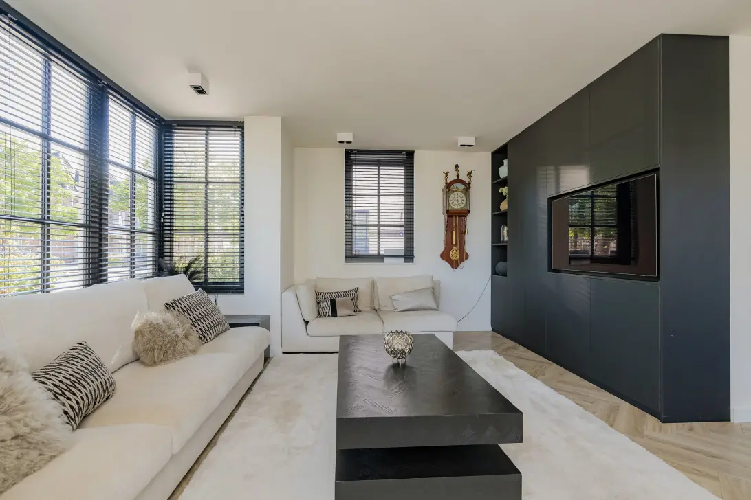 In de hal, met garderobekast en gastentoilet, geven stalen deuren toegang tot de ruime, zeer lichte woonkamer met fraai wandmeubel en een grote erker. Aan de achterzijde van de woning is de ruime woonkeuken met kookeiland gesitueerd - perfect om samen te komen met familie en vrienden. Twee paar openslaande deuren naar de tuin maken dat binnen en buiten moeiteloos in elkaar overlopen. Dankzij de vloerverwarming geniet je hier het hele jaar door van een behagelijke temperatuur.