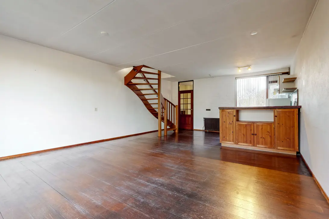 Indeling: uitgebouwde entree met toilet en binnendoor bereikbare berging, open keuken met eenvoudige rechte unit, tuingerichte woonkamer met plankenvloer, open trapopgang en uitzicht op “Station Zwaag”.