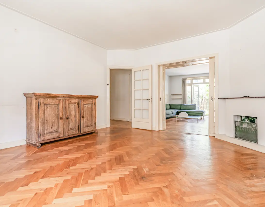 Aan de rechterzijde vind je de sfeervolle doorzon woonkamer, voorzien van karakteristieke en suite deuren en praktische inbouwkasten. Deze ruimte loopt over in een royale multifunctionele kamer, die zich perfect leent voor uiteenlopende doeleinden. Vanuit de woonkamer openen de deuren naar de uitzonderlijk ruime en zonnige tuin, waardoor binnen en buiten op een natuurlijke manier in elkaar overlopen.