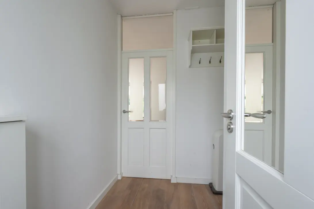 Ruime hal, meterkast en modern toilet (2019). Tuingerichte woonkamer met houten parketvloer. De tuin bereikt u via de hal aan de achterzijde van de woning. Aan de achterzijde grenst de tuin aan een groenstrook van de gemeente waardoor er veel privacy is. Aan de voorzijde van de woning treft u de moderne en luxe open keuken (ca. 2018) voorzien van inbouwapparatuur.