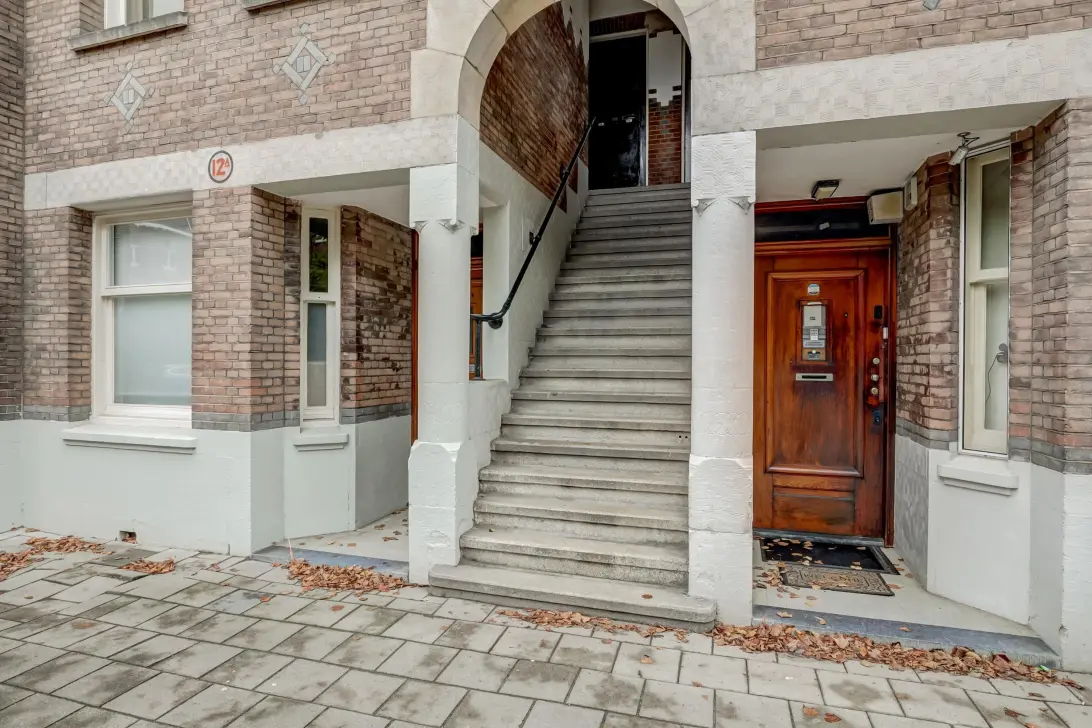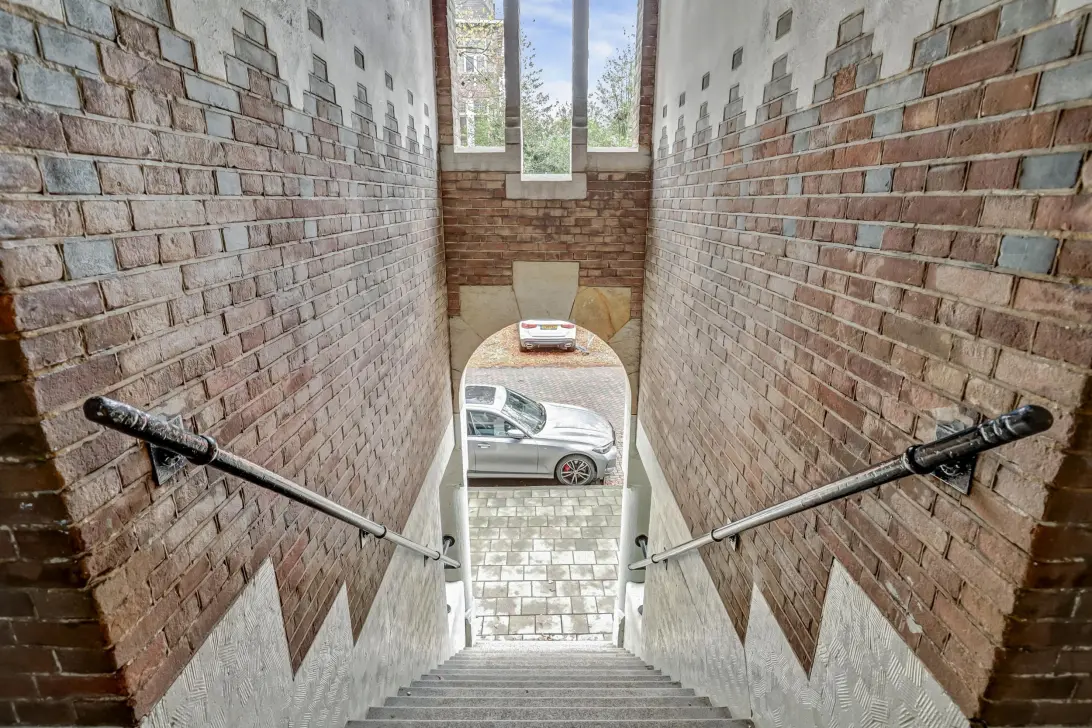 Via de hardstenen trap kom je op het bordes, dat toegang geeft tot de woningen.