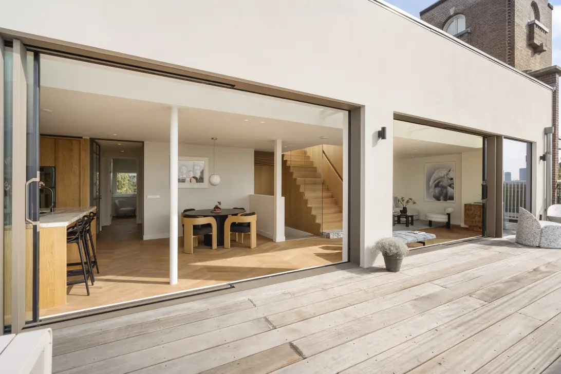 Aan de achterzijde is het woongedeelte gecreëerd met een indrukwekkende glazen met de hand op maat gemaakte achterpui over de gehele breedte van de twee panden van bijna 14 meter. Deze pui is volledig opgetrokken van vloer tot plafond, dit maakt het appartement uitzonderlijk licht en uniek en lopen binnen en buiten naadloos in elkaar over. Ook de lichtstraat loopt over de gehele breedte van het appartement en geeft vooral in de avond een adembenemend effect. Zowel het glas van de pui als de lichtstraat zijn zon- en warmte werend. Het terras heeft een grootte van bijna 40m2 en is gelegen op het zuidwest en van alle denkbare gemakken voorzien.