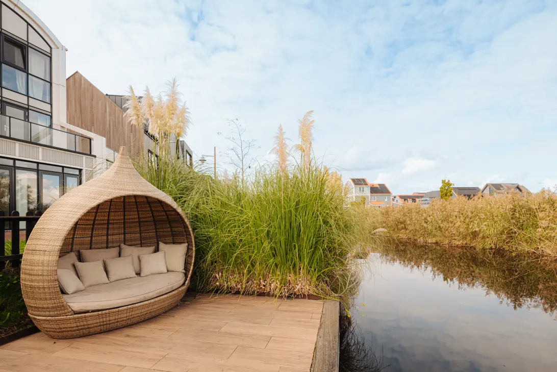 - Privé terras aan afgesloten waterpartij aan de voorzijde van de woning waar je heerlijk kunt suppen of waar de kinderen in een opblaasboot kunnen varen.