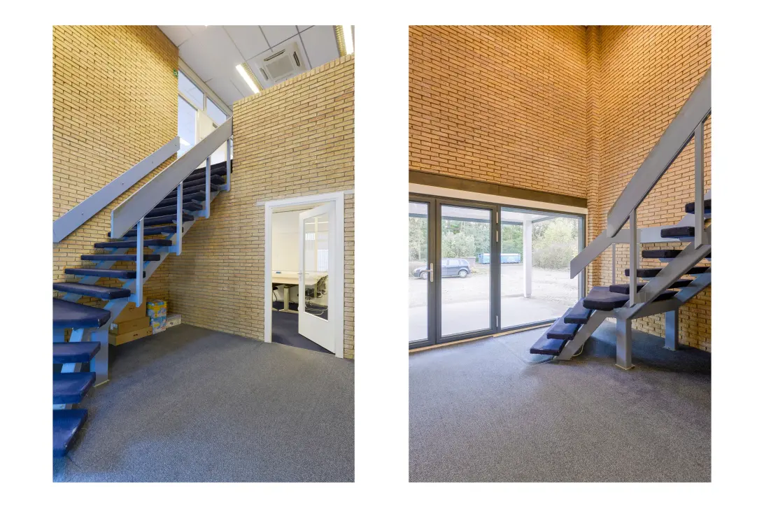 De kantoor-/bedrijfsruimte bestaat uit totaal ca. 432 m2, waarvan ca. 70 m2 gelegen op de begane grond (entree/hal, trapopgang en twee kamers plus opslag) en ca. 362 m2 op de eerste (via een brede trap met vide).