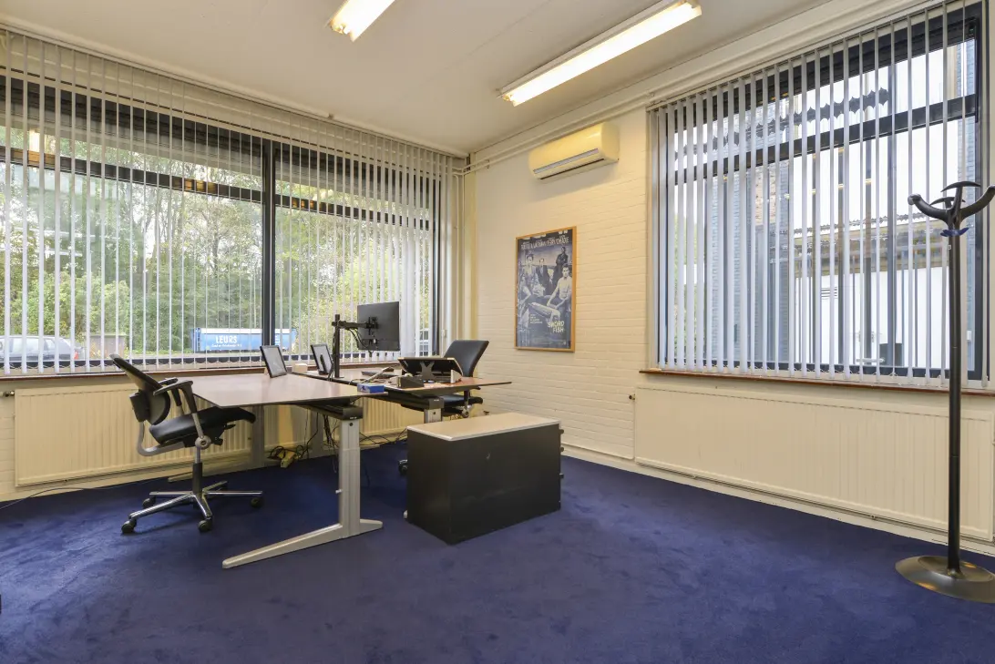 Door de hoekligging zijn de kamers zeer licht, mede door de grote ramen en twee lichtkoepels. Recent zijn de ramen/kozijnen vervangen in zwart geïsoleerde aluminium kozijnen met HR++ beglazing. Complete afwerking inclusief (eventueel flexibele indeling ) scheidingswanden, bestaande uit diverse kantoorkamers, vergaderzaal, archiefruimte, studio- of productieruimte, twee toiletgroepen en een keuken. Ruime lichte centrale binnenhal op de verdieping, te gebruiken als receptie. Afwerking bestaat uit o.a. systeemplafonds met led lichtarmaturen, wandgoten t.b.v. electra en databekabeling in alle vertrekken, diverse airconditionings, keuken met vaatwasser, alsmede vaste vloerbedekking.