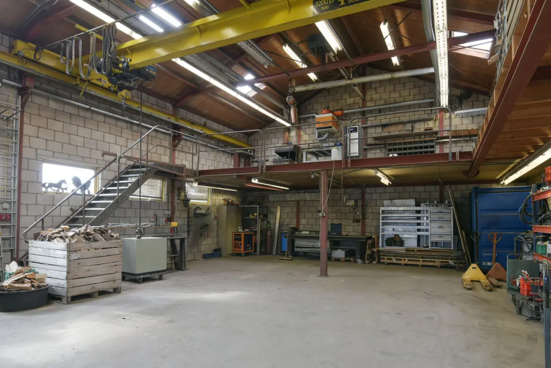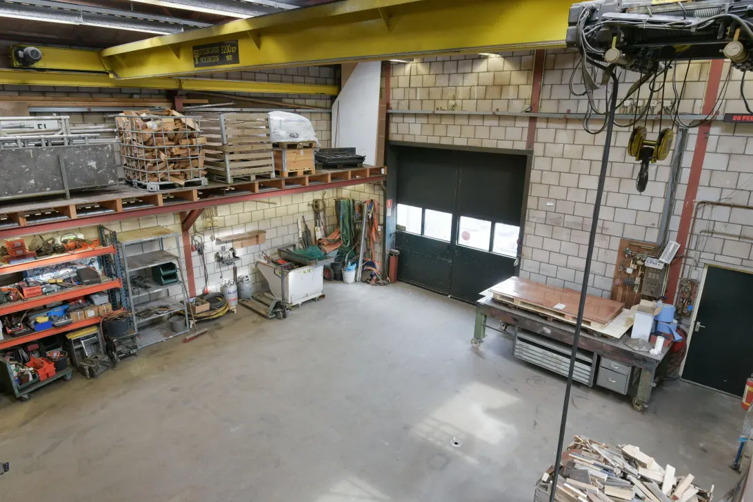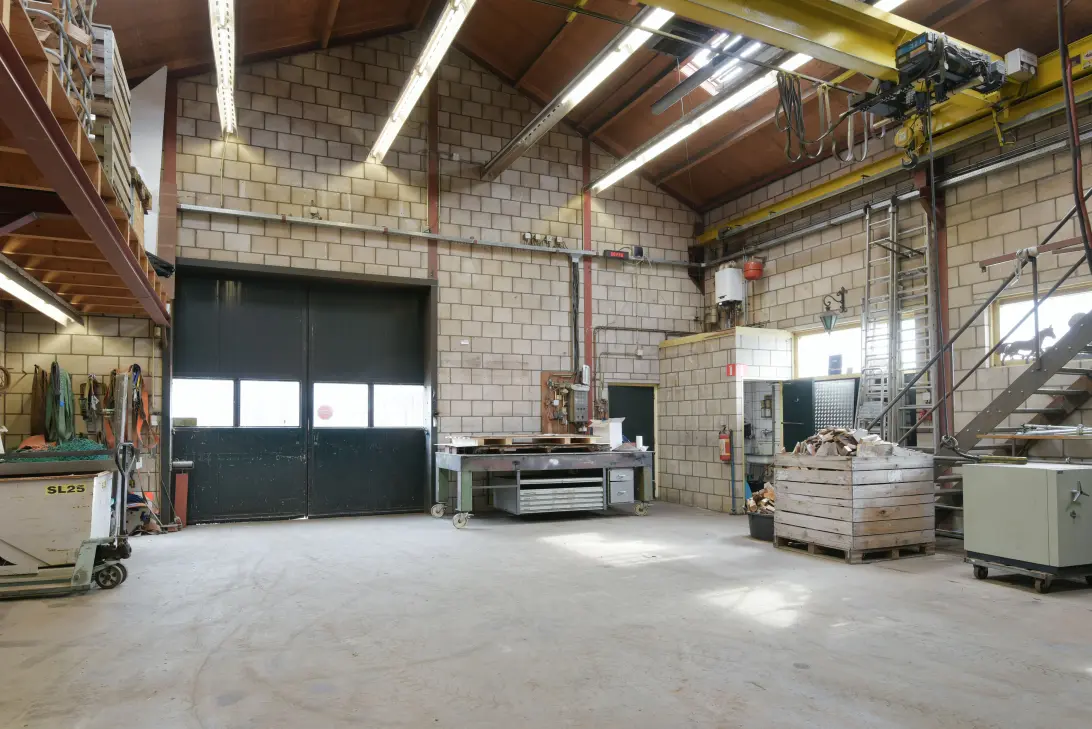 De werkplaats is voorzien van schuifdeuren, een vloeistofdichte betonvloer en krachtstroom. Er is een toiletruimte aanwezig en in het souterrain vindt u een keuken/kantine en kantoorruimte. Het souterrain is bereikbaar via een trap, maar er is tevens een goederenlift aanwezig vanaf het voorterrein. Mede door deze lift is de werkplaats multifunctioneel inzetbaar.