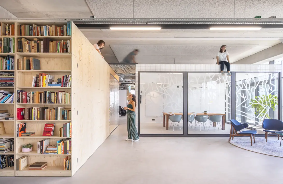 Het interieur, ontworpen door Standard Studio, heeft een A+++ energielabel en combineert industriële elementen met warme, huiselijke touches. Grote raampartijen zorgen voor overvloedig natuurlijk daglicht van alle kanten, terwijl moderne klimaatbeheersing met airconditioning en vloerverwarming een aangenaam werkklimaat garandeert. Het kantoor beschikt over diverse ruimtes met unieke kantoorfuncties, waarbij de industriële uitstraling wordt verzacht door huiselijke elementen die bijdragen aan een prettige werksfeer.