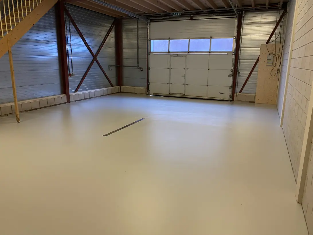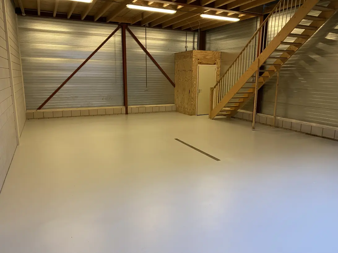 Entree via een overheaddeur (voorzien van loopdeur), toegang tot de bedrijfsruimte met een totaal b.v.o. van ca. 93 m². Op de verdieping eveneens 92 m² bedrijfsruimte met kleine kantine - dagverblijf. Op de verdieping beschikt het pand zowel in de voorgevel, alsmede de zijgevel over ramen voor goed daglicht.