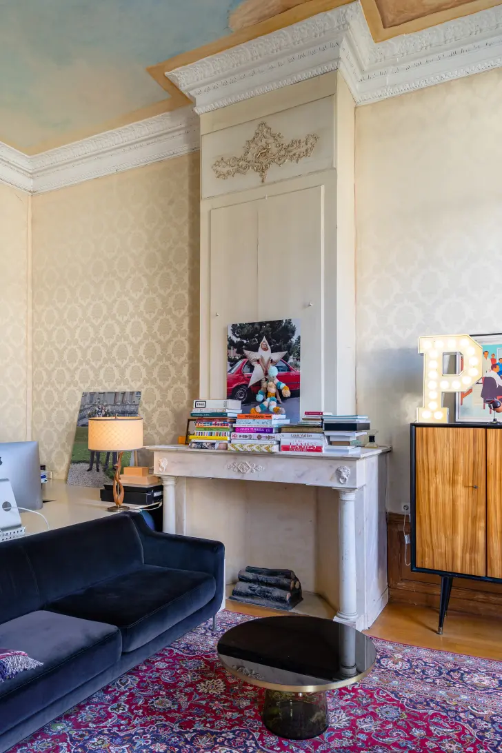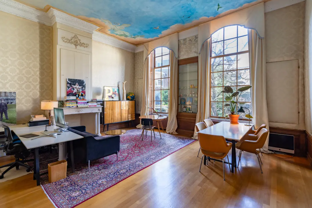 Vanuit deze ruimte hebt u de hoofdkamer van ruim 45 m2. Deze indrukwekkende kamer is voorzien van een authentiek beschilderd plafond van maar liefst 4,32 meter hoog. De twee grote ramen bieden een prachtig uitzicht op de groene binnentuin. Ook de marmeren haard geeft deze klassieke ruimte extra karakter.