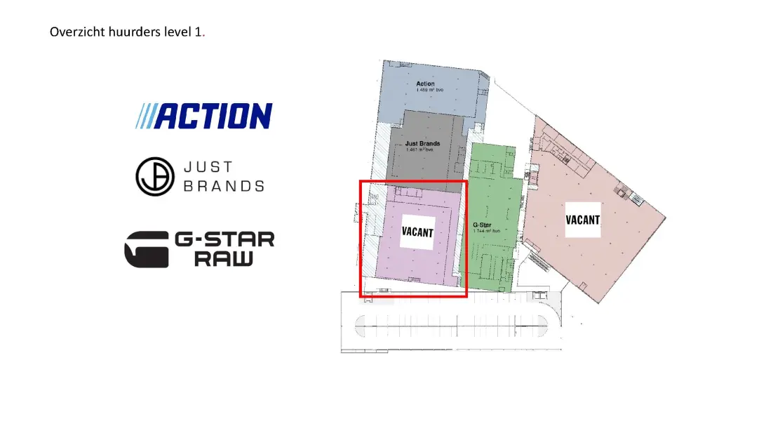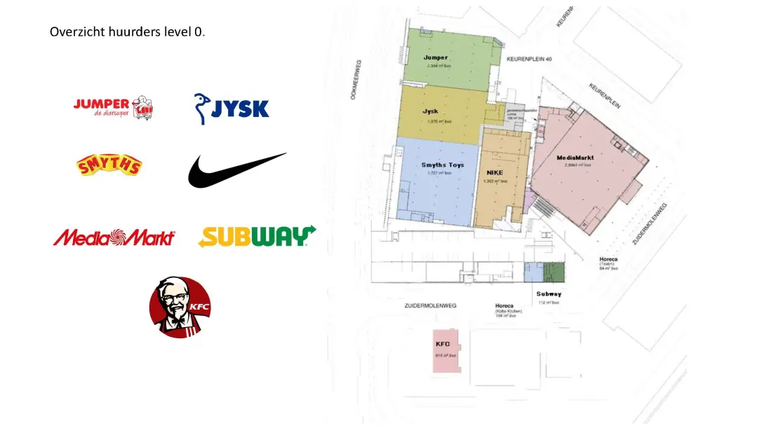 Hier zijn o.a. gevestigd Action, MediaMarkt, Jysk, G-star Raw Outlet, Nike Outlet, Just Brands Outlet, Jumper, KFC, Smyths Toys en Basic Fit.