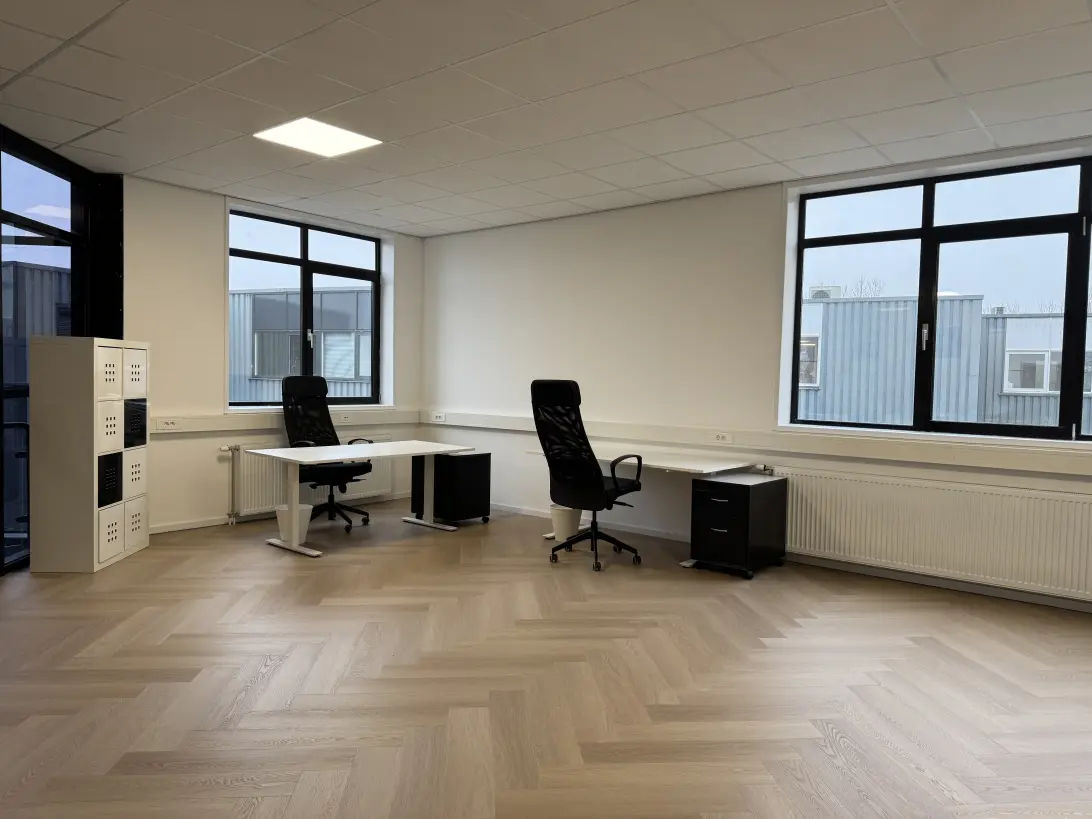 De kantoorruimte L-vormig gelegen, maar nadere indeling kan zorgen voor 2 x een rechthoekige ruimte met een aparte (eventueel gemeenschappelijke) vergaderzaal, of separate kantoorruimte.