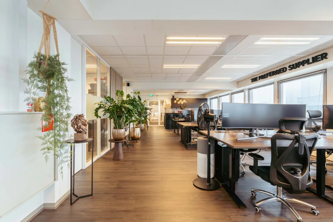 Strategisch geplaatste planten en stijlvolle natuurfoto's dragen bij aan een aangename werkomgeving. De akoestiek is zorgvuldig afgestemd op een kantooromgeving, waardoor gesprekken niet storend zijn voor anderen. Een blikvanger is de pantry met hexagon wandtegels, die niet alleen functioneel is maar ook bijdraagt aan de esthetische kwaliteit van het kantoor.