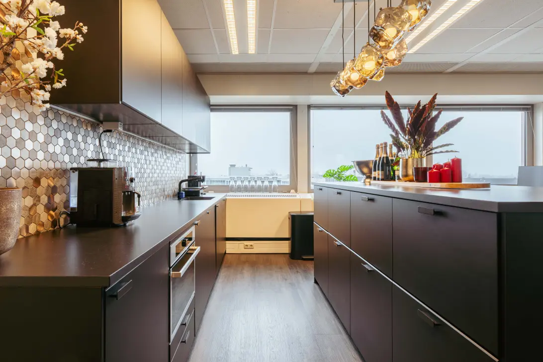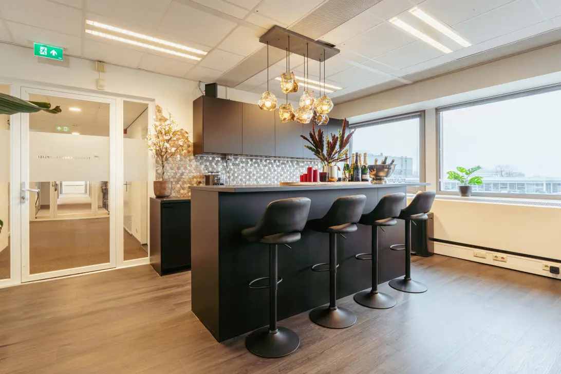 De ruimte beschikt over glasvezel internetverbinding, airconditioning en 24/7 toegang. Een aantrekkelijk aspect is de moderne pantry met een keukenblok dat tevens fungeert als bar. Deze ruimte biedt een ideale plek voor informele teambijeenkomsten, lunches of koffiepauzes. De hexagon tegels geven deze ruimte een moderne uitstraling die bijdraagt aan de professionele sfeer van het kantoor.