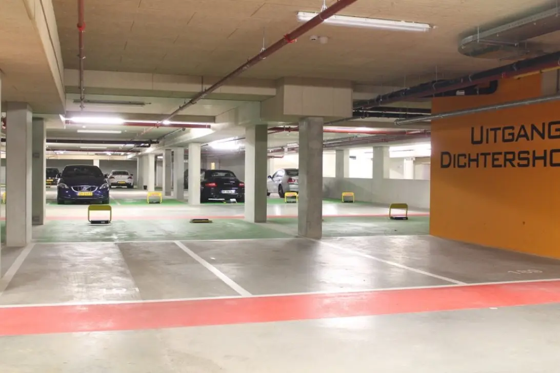 Te huur ruime en luxe parkeerplaats in appartementencomplex "de Oranje" in Overhoeks, Amsterdam-Noord. Nieuwbouw.