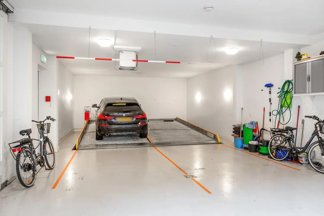Bediening van de roldeur via handzender op afstand en is alleen toegankelijk voor bewoners en mensen die een parkeerplaats huren.