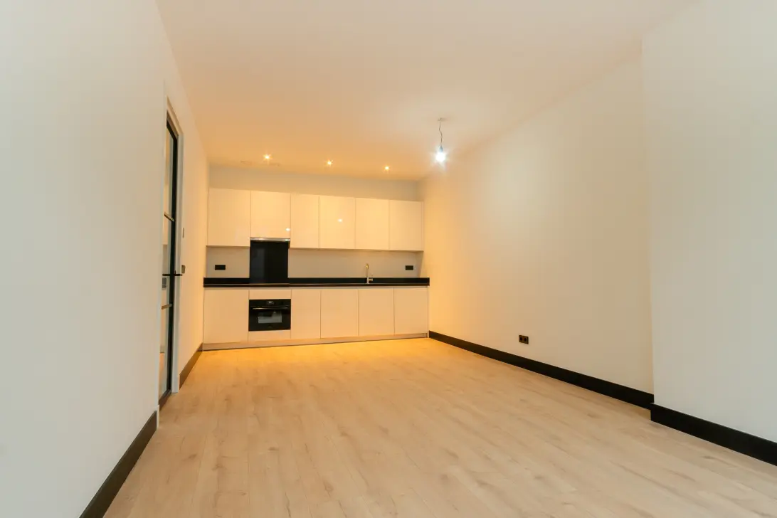 De tweede slaapkamer bevindt zich aan de voorzijde. De woonkamer is licht en prettig ingedeeld met open keuken inclusief diverse inbouwapparatuur.