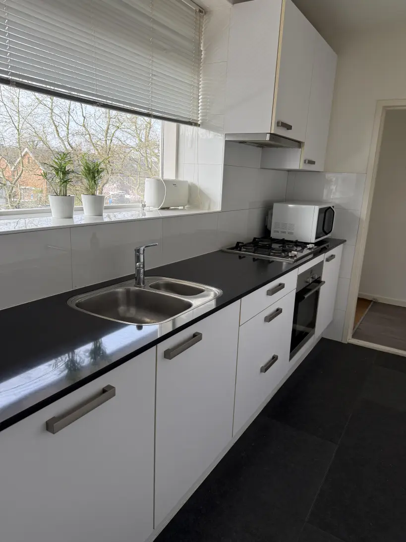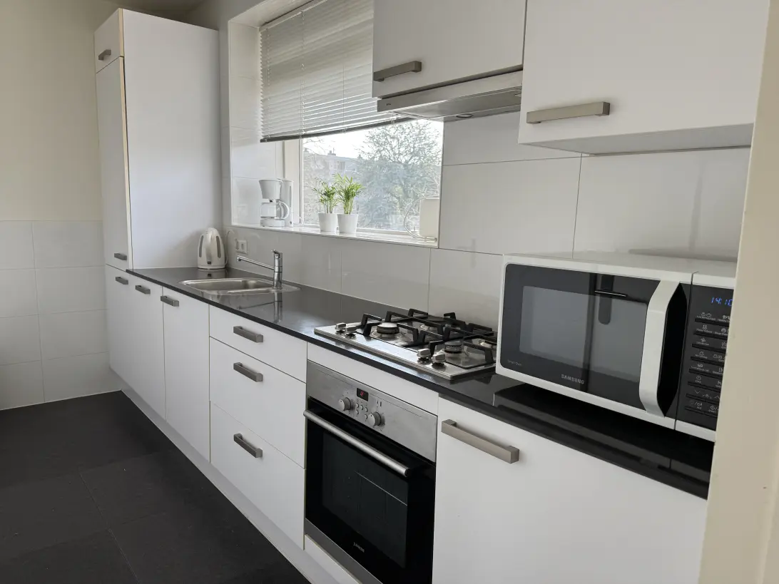 De keuken is aan de voorzijde van de woning gelegen (galerijzijde) en uitgerust met diverse losse- en inbouwapparatuur. Extra bergruimte in de keuken is aanwezig middels een inbouwkast. Het aanrechtblad (composiet) is lang en voorzien van een spoelbak en een gasfornuis met vier pitten.