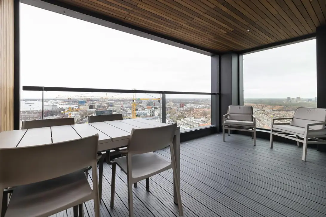 Spacious and brightly furnished two-bedroom apartment on the north side of the tower and offers a spectacular view over the surrounding area and the IJ. With the ferry from Buiksloterweg you can reach Central Station and the city center in less than five minutes.