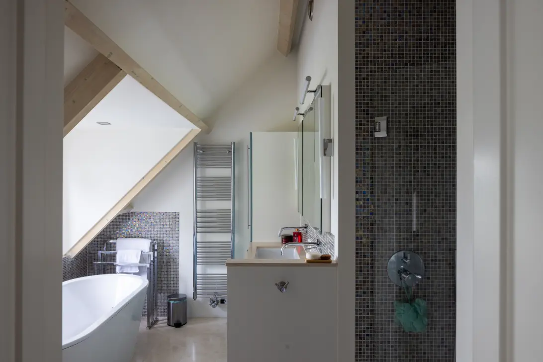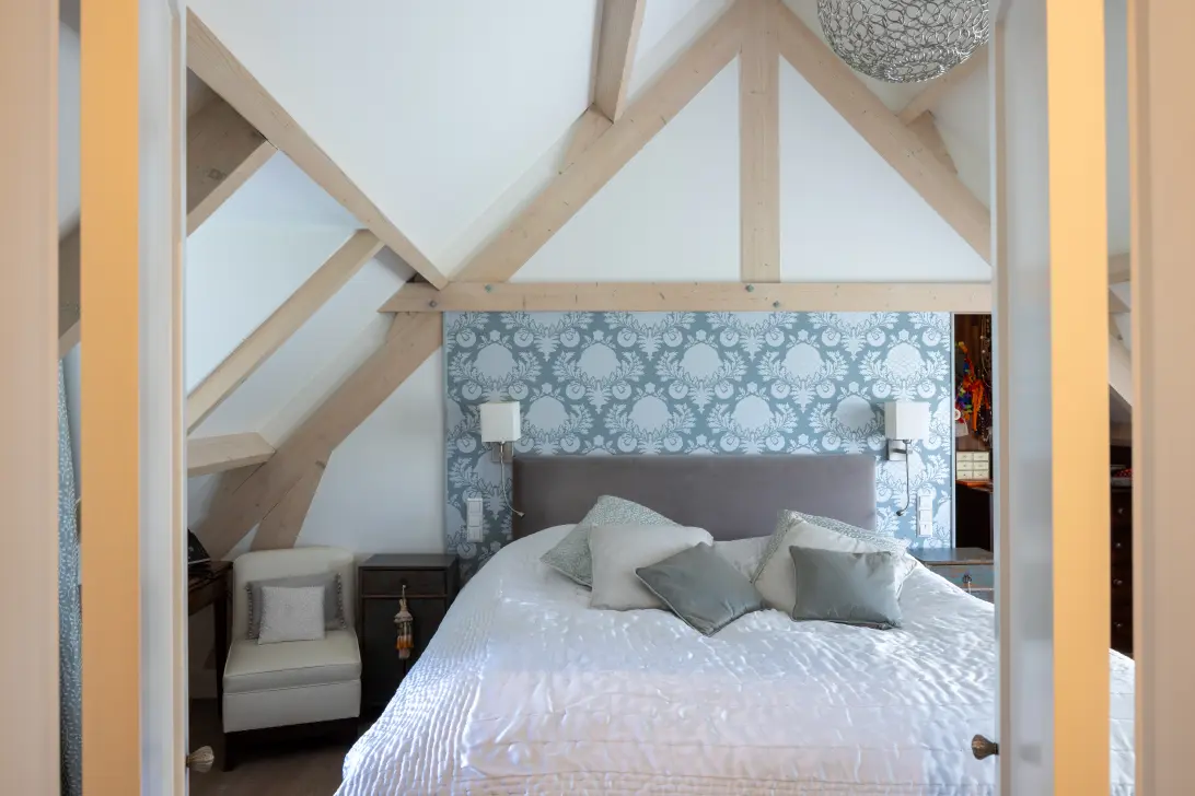 Wat direct opvalt is de sfeervolle, riante woonkeuken en woonkamer met open haard – het kloppend hart van het huis. Hier komen gezelligheid en functionaliteit samen. Koken terwijl je uitkijkt over het water, dineren met de hele familie of borrelen met vrienden: het kan allemaal. De woonruimtes zijn licht en ruimtelijk, met grote raampartijen die het uitzicht omarmen en het buitenleven naar binnen halen.