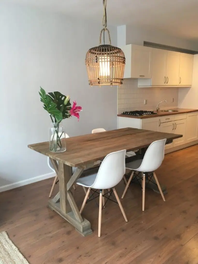 The apartment has a fully equipped open kitchen, dining table and bright living with a French balcony.