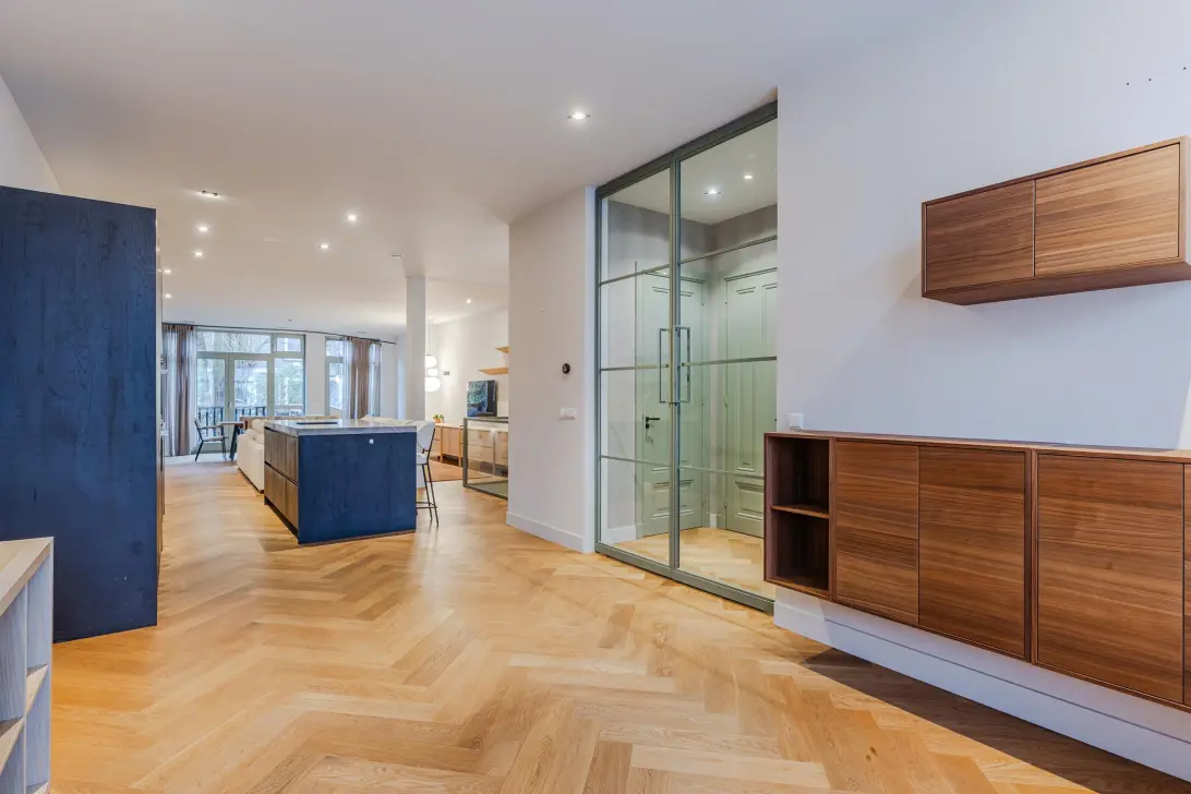 At the heart of the room is the luxurious kitchen with a central island, which also serves as a bar with four comfortable bar stools; a true eye-catcher and the centrepiece of the home. The kitchen is fitted with Siemens studioLine built-in appliances. The island is ideal for both cooking and informal gatherings. At the rear, there is ample space for a generous sitting area, adjoining French doors opening onto the garden, creating a pleasant connection between indoor and outdoor living.