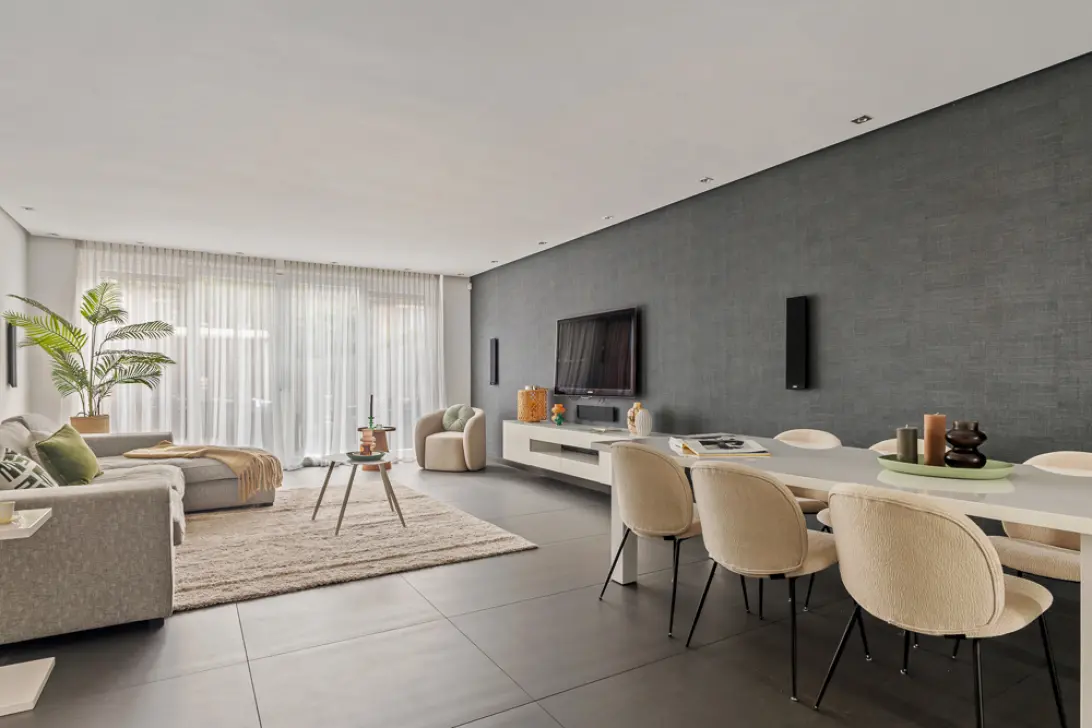 Via de hal met modern toilet en trapopgang stap je binnen in een lichte woonkamer met uitbouw en grote raampartijen. De ruimte ademt rust en modern comfort.