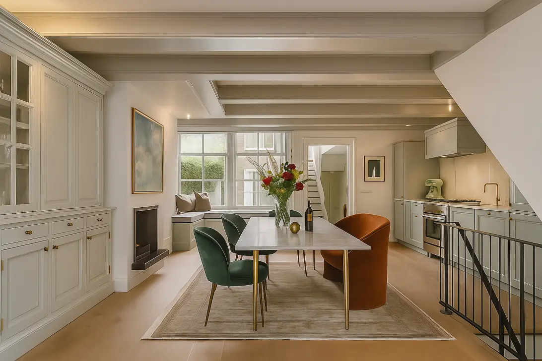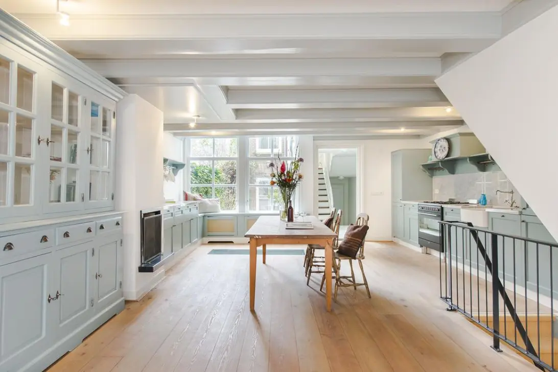 A neat communal entrance leads to the apartment, located on the first two floors at the front side of the house and on three floors at the back. On the ground floor is a large and recently renovated kitchen, with a fireplace and windows on both the canal and the quiet garden side. At the back of this floor is the first bedroom with a bathroom and French doors leading directly to the garden. The large, centrally-located historical staircase connects all the other spaces together.