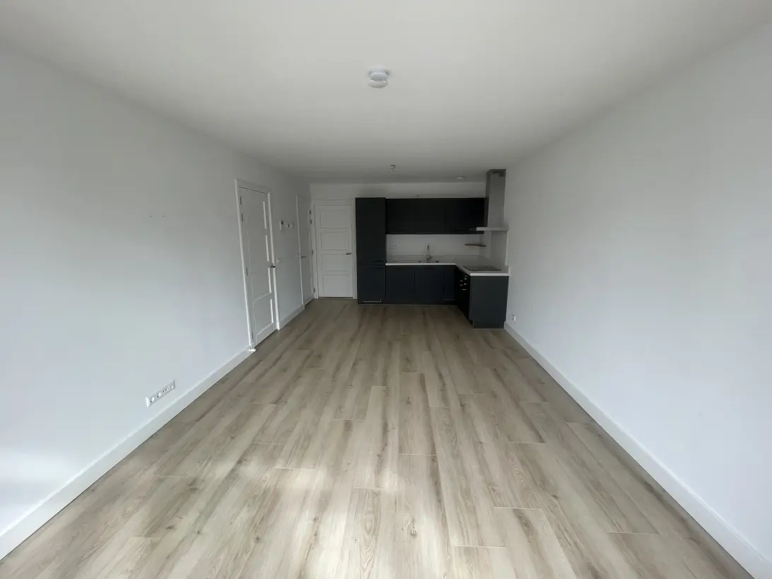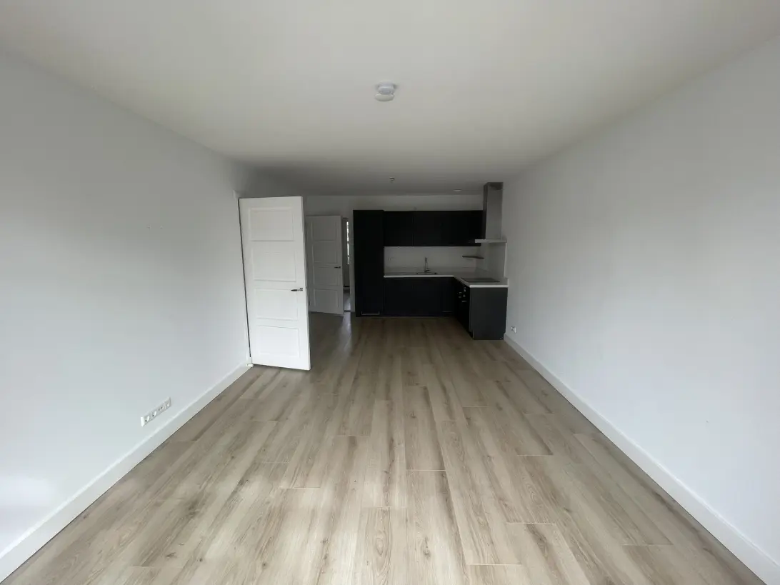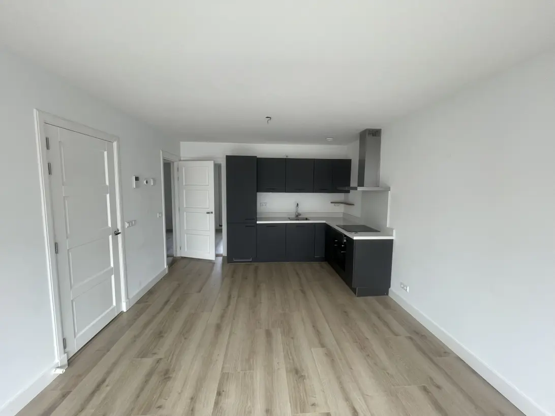 Appartement op de eerste verdieping met een open keuken en woonkamer.