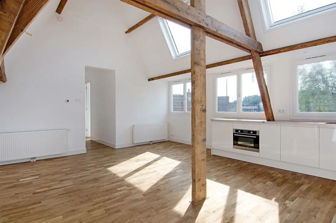 Modern and bright 3-bedroom apartment of 87 m² on the third floor/top floor, featuring a beautiful exposed beam structure and a spacious ROOF TERRACE, located on Mosplein in the heart of Amsterdam-Noord.