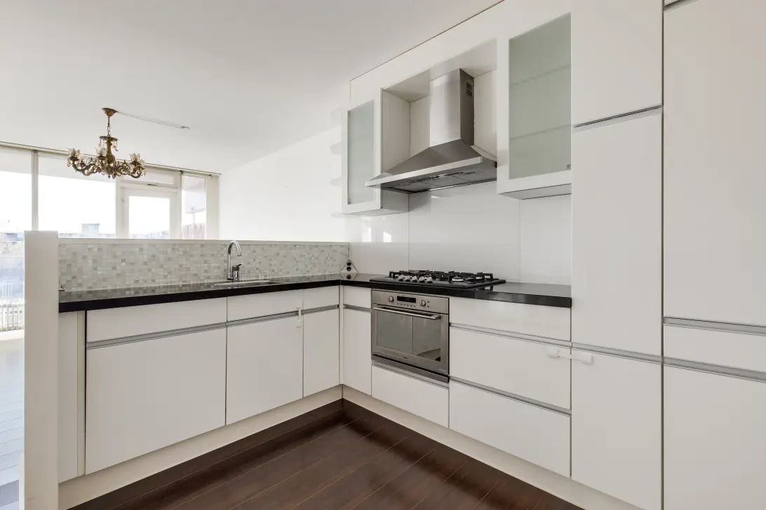 Ruime en lichte woonkamer met moderne open keuken voorzien van 5-pits gaskookplaat en RVS afzuigkap, combi-oven, vaatwasser en koel-/vrieskast en vaste kast met groepenkast.