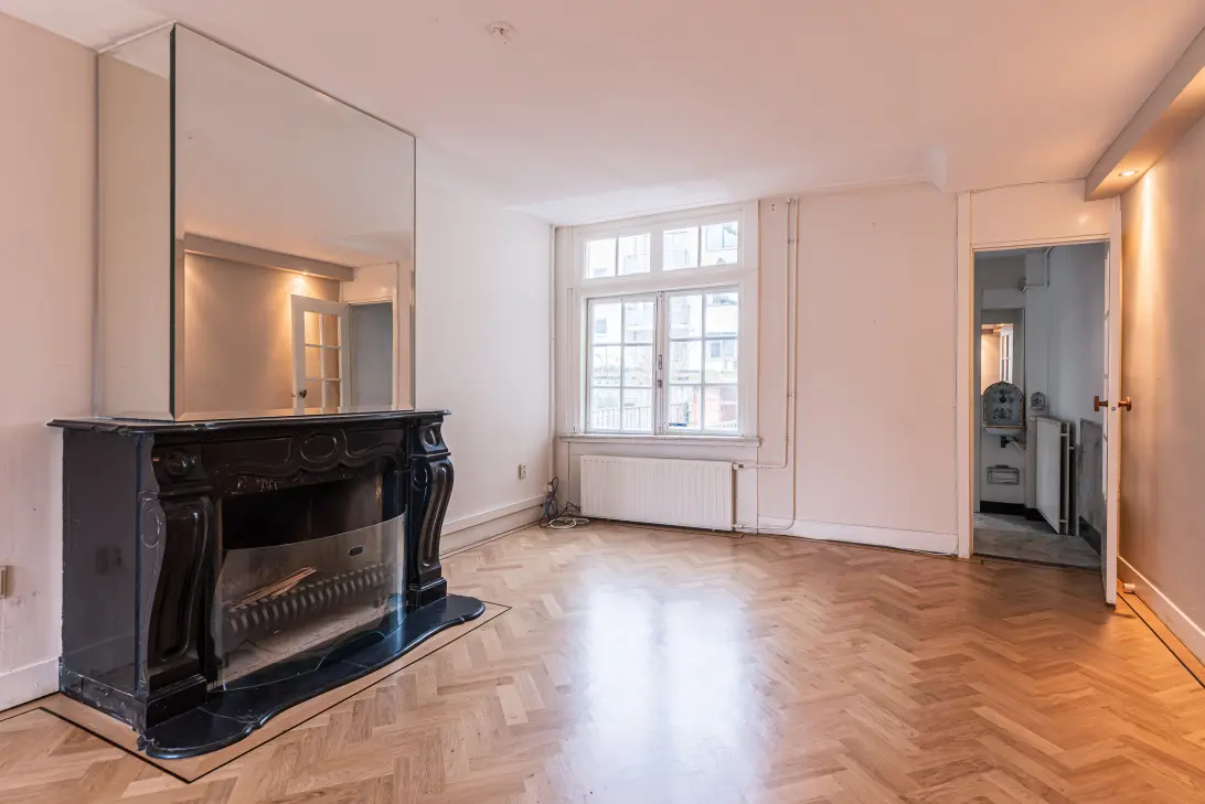 Ruime en stijlvolle living: Geniet van de sfeervolle woonkamer met een prachtige open haard en een moderne visgraat parketvloer – de perfecte plek om te ontspannen na een drukke werkdag.