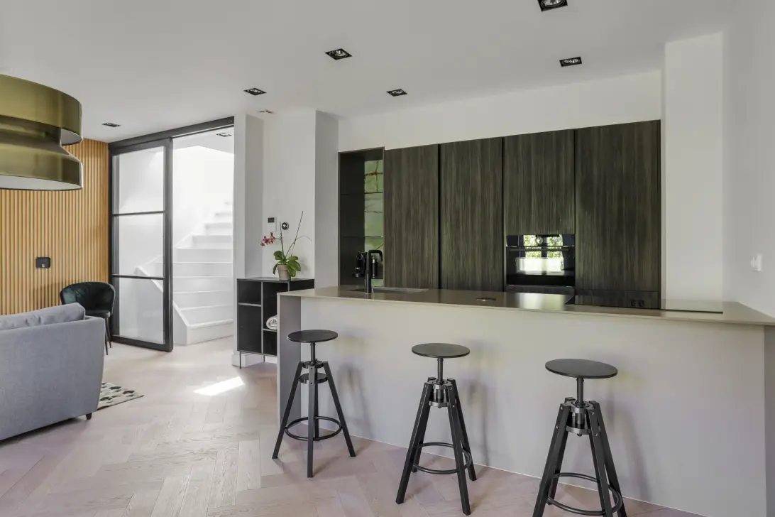 Via het gemeenschappelijke trappenhuis bereik je de entree van de woning. Bij binnenkomst in de woning op de derde verdieping kom je aan de rechterzijde in de woonkamer terecht welke is voorzien van een zeer luxe keuken met kookeiland en afwerkingen van groene onyx. Het grote aantal ramen en de lichte eikenhouten vissengraat vloer zorgen voor een zeer open en lichte ruimte.