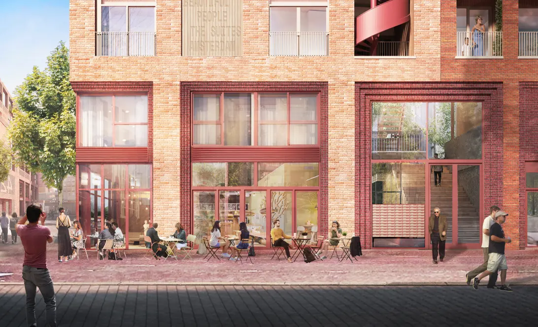 The/suites, gelegen aan het begin van de hoofdwinkelstraat (Rudi van Dantzigstraat) van deze buurt, biedt met een aantrekkelijke plint een warm ontvangst voor de bezoekers en bewoners van de Sluisbuurt.