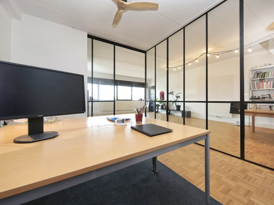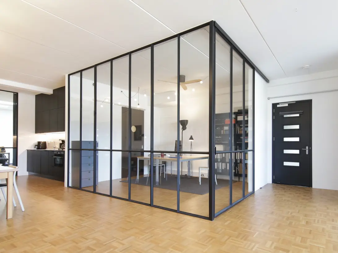 Deze ruimte beschikt over drie toegangsmogelijkheden; twee deuren vanuit de hal en een deur vanuit de woning, welke eventueel kan worden verwijderd c.q. afgesloten. Het kantoorgedeelte heeft twee, door glazen wanden, afgescheiden kantoorruimtes. In één van deze ruimtes is extra licht gecreëerd doordat er vier dakramen zijn geplaatst. De pantry bevindt zich in het midden van de ruimte en is voorzien van inbouwapparatuur van AEG. Verder zijn er twee toiletruimtes met douche aanwezig en een bergruimte. De ruimtelijk indeling kan worden gewijzigd. De glazen wanden staan op de parketvloer en kunnen eventueel worden verplaatst of aangepast naar eigen wens.