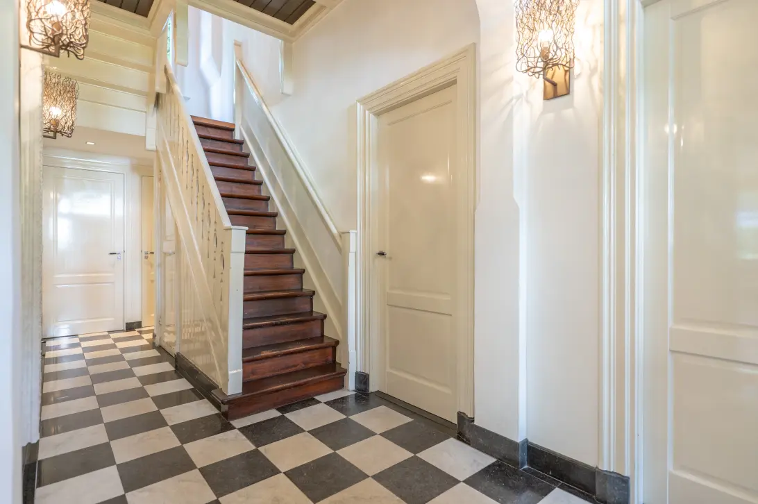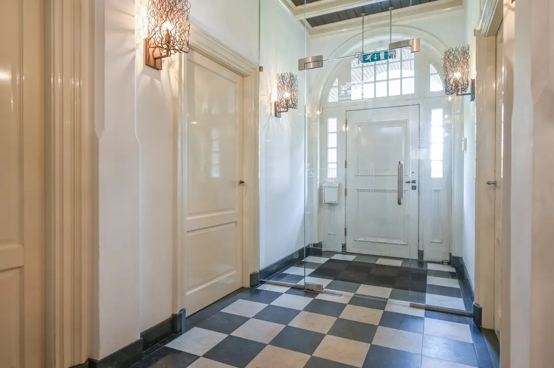 * Alle kamers hebben een stijlvolle visgraatparketvloer, houten lambrisering, een hoog plafond met inbouwspots en glad gestucte omlijsting.