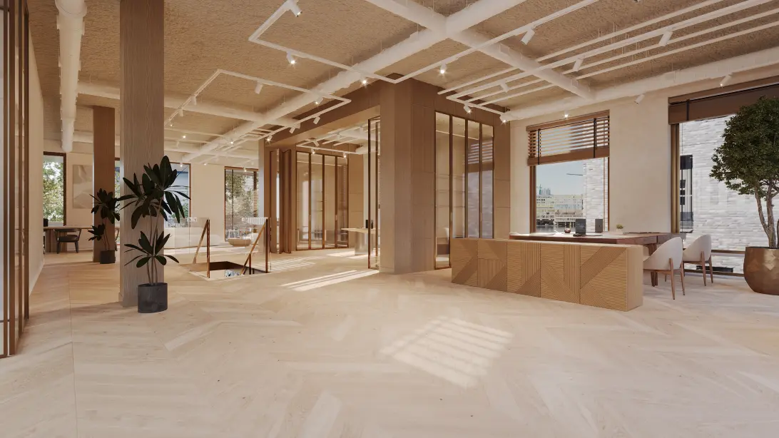De algemene ruimten worden voorzien van een volledige hoogwaardige vloer- en wandafwerking. De kantoorverdiepingen worden opgeleverd in casco staat. Kleuren, materialen en afwerkingen zijn conform de kleur- en materiaalstaat van Prosman de Wit Architecten.
