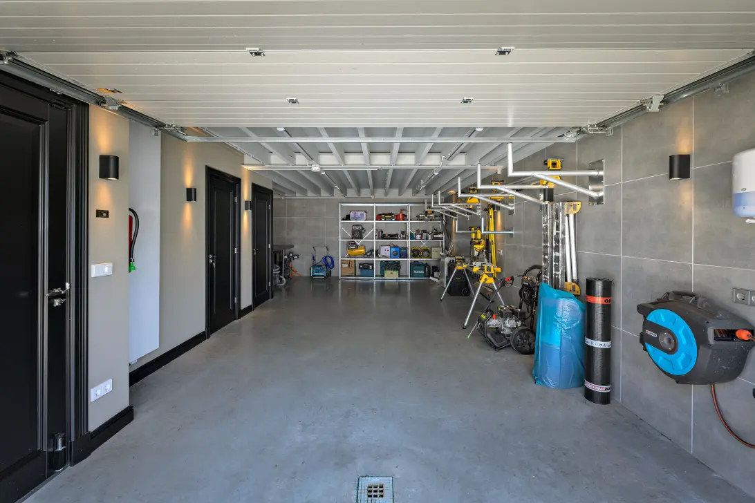 Ground floor: entrance hall with meter cupboard and beautifully finished staircase to the upper floors. The perfectly finished garage / workspace with modern toilet and spacious stairs cupboard is accessible from the hall and through the over 3.80 metre wide overhead rolling door.