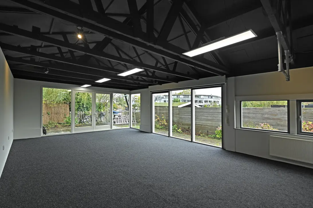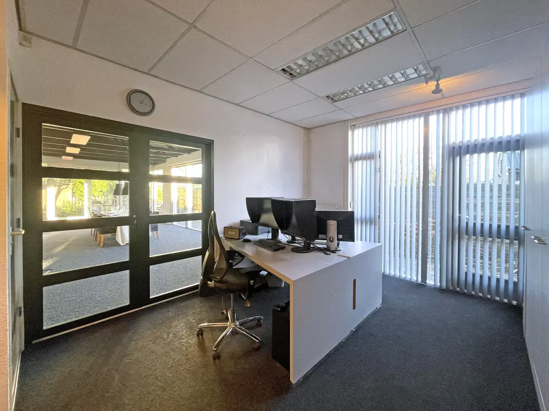De bedrijfsruimte is toegankelijk via de lange oprit en beschikt over meerdere ruimtes die momenteel in gebruik zijn als kantoor, opslag en studio. De indeling is flexibel en kan eenvoudig worden aangepast aan de wensen van de nieuwe eigenaar of gebruiker. De ruimte is volledig geïsoleerd en biedt daglichttoetreding, waardoor deze geschikt is voor representatieve doeleinden.