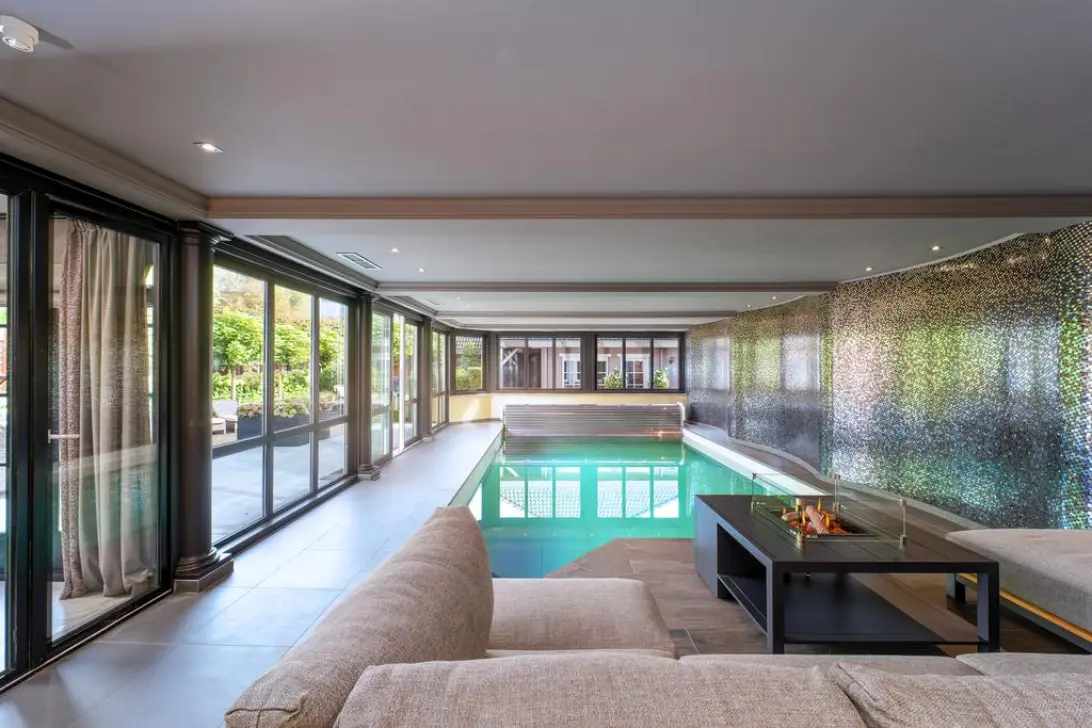 Een van de absolute hoogtepunten is het inpandige zwembad met wellnessruimte. Dit exclusieve zwembad (gerenoveerd in 2022) is fraai geïntegreerd in de villa en wordt gescheiden van de living door een glazen wand. Vanuit de zwembadruimte heeft u direct toegang tot de riante tuin met een groot terras, ideaal om te ontspannen in een luxe loungesetting.