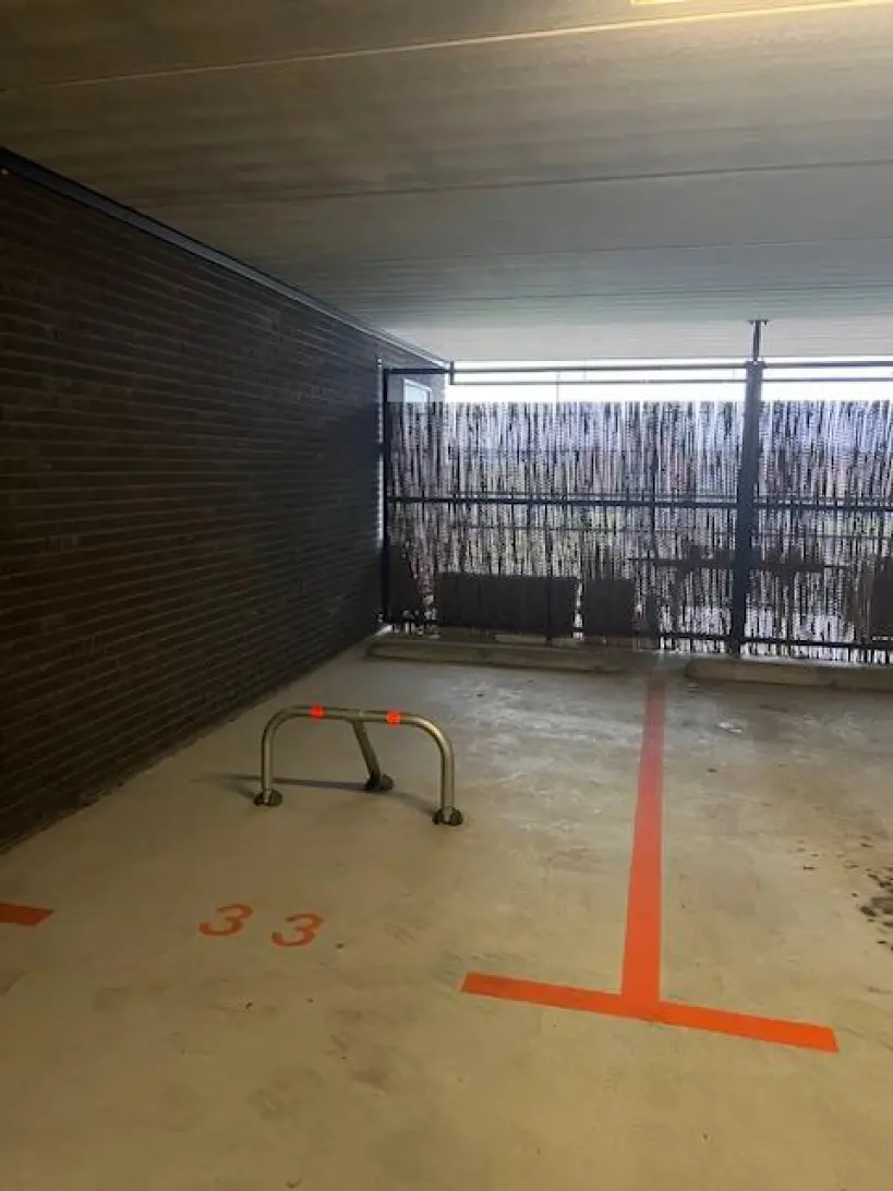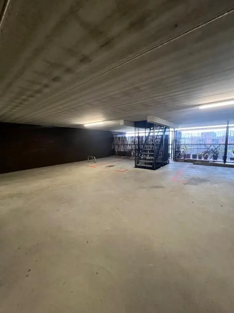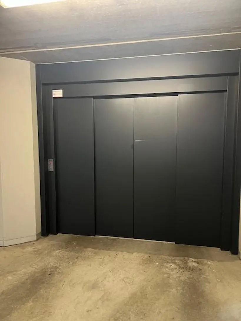 Met de autolift naar de vierde verdieping waar de auto veilig kan staan op een klein parkeerdek.